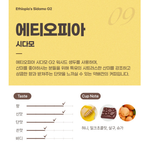 워시드 방식의 생두를 로스팅했으며 산미를 좋아하시는 분들을 위해