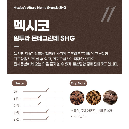 적당한 바디와 구운 아몬드 계열의 고소함,